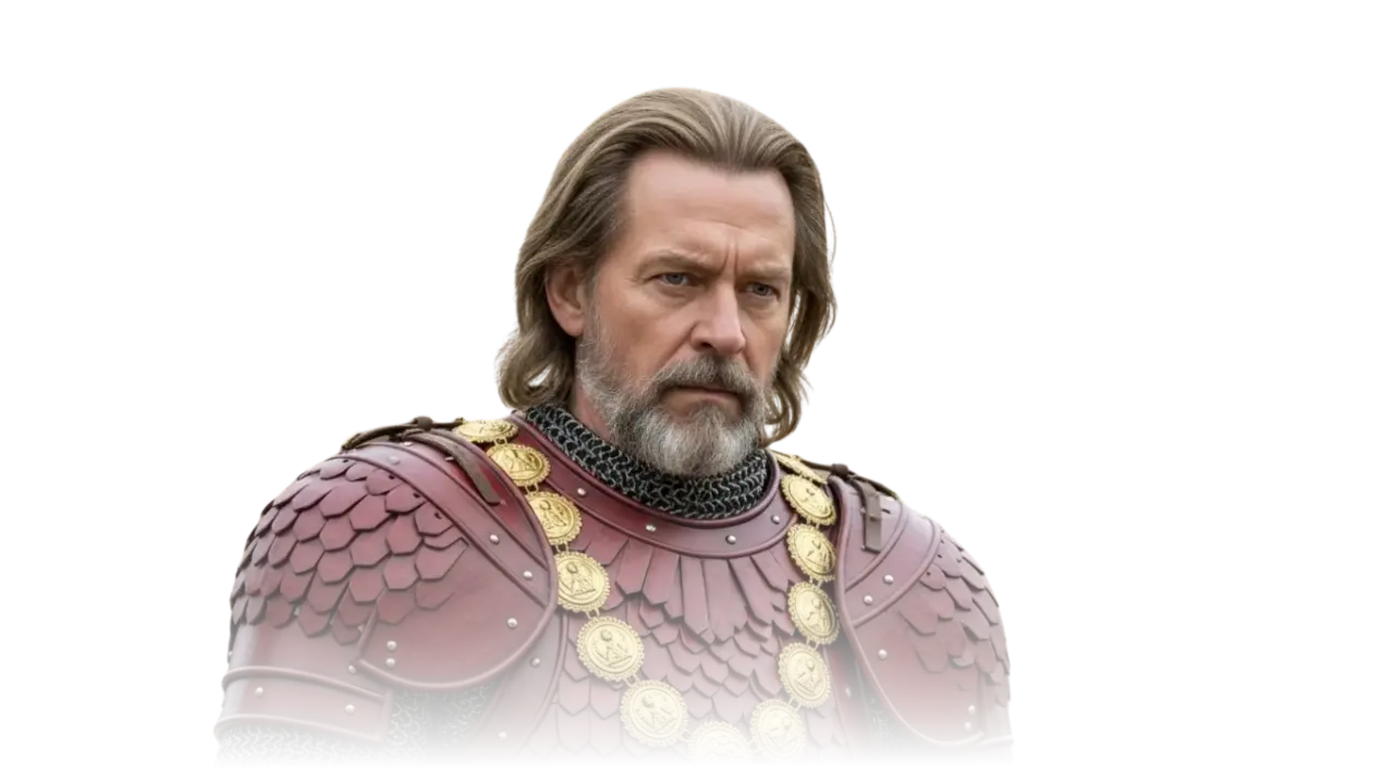Testemunhei esta força em sua manifestação mais pura quando um dardo envenenado atravessou sua mão direita durante a emboscada no saguão do Palácio Elevado. Vi o sangue escorrer, vi a agonia em seus olhos, pois era veneno das terras além-mar. Mas suas primeiras palavras, ditas entre dentes cerrados como portões de ferro, não foram lamentos sobre sua própria dor mortal. Não! Ele perguntou, com a voz de um comandante que não conhece derrota: “Viu um homem ou um vulto… ou qualquer coisa assim, general?”